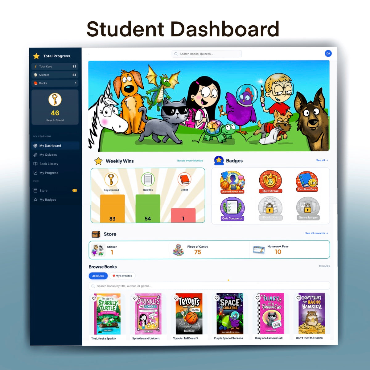 Earn keys, badges, streaks, and rewards tied directly to reading and comprehension.