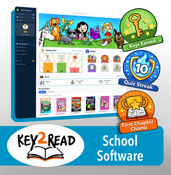 Students read a physical Key Chapter Book, take short comprehension quizzes, earn keys, and unlock rewards. On the back end, the Teacher Dashboard provides clear reading score trends, comprehension data, quiz activity, and visibility into who needs support — making growth easy to see and easy to act on.